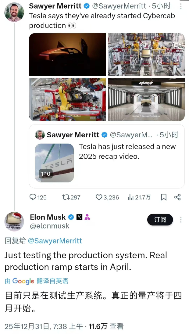 【CNMO科技消息】12月31日,特斯拉CEO埃隆·马斯克在X平台确认,专为无人驾驶设计的Robotaxi车型Cybercab将于2026年4月在得州超级工厂启动批量生产。这款两座电动车定位为L4级自动驾驶车辆,初期将用于特斯拉自有Robotaxi网络运营,标志着其完全无人化出行服务进入落地阶段。